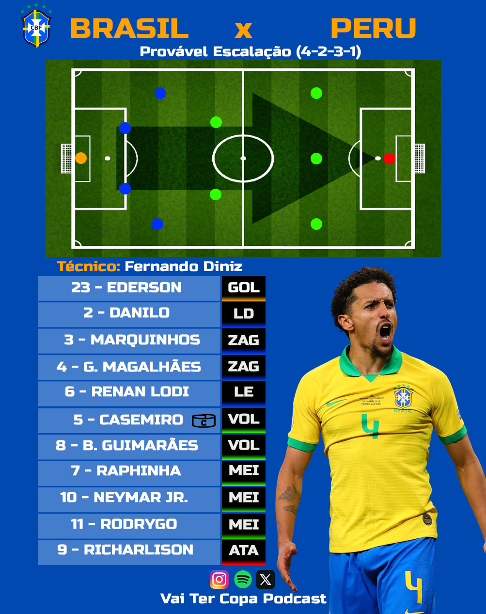 O técnico Fernando Diniz falou com a imprensa em entrevista coletiva na noite desta segunda-feira, 11. O treinador confirmou a escalação para o próximo jogo, o time será o mesmo que goleou a Bolívia. Portanto a escalação será: Ederson; Danilo, Marquinhos, Gabriel Magalhães e Renan Lodi; Casemiro e Bruno Guimarães; Raphinha, Neymar e Rodrygo; e Richarlison.