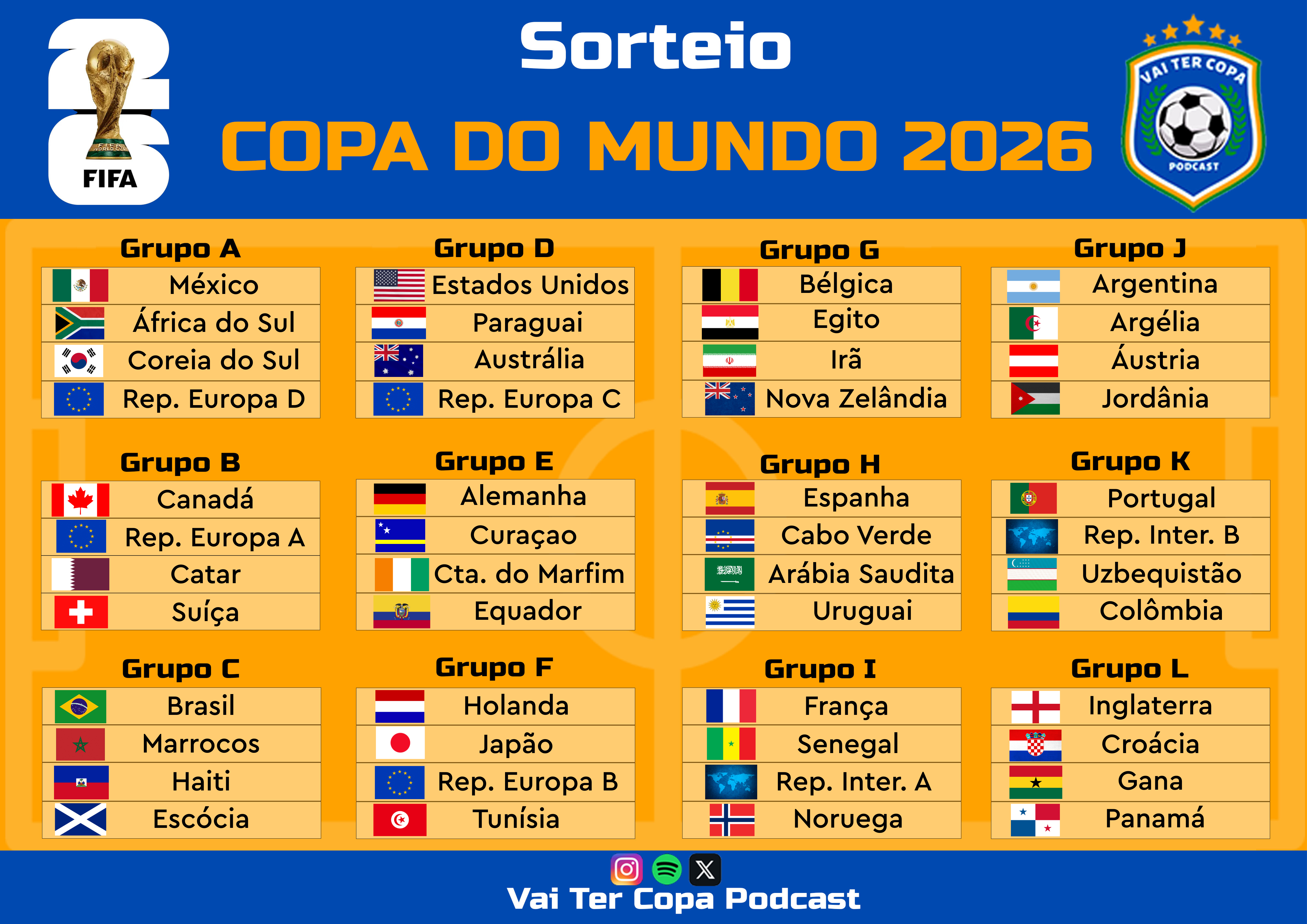 A FIFA realizou na tarde desta sexta-feira, 5, o sorteio dos grupos da Copa do Mundo de 2026. O evento foi realizado no John F. Kennedy Center, em Washignton D.C., capital dos Estados Unidos, que é um dos países-sede do torneio, ao lado de Canadá e México.